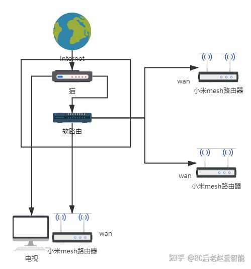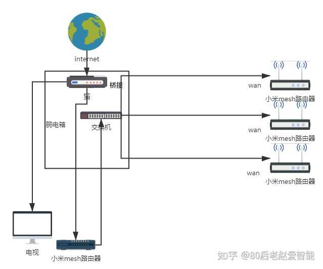 1、让网络供应商将你家的光猫改为光猫拨号模式,新办宽带默认是此模式,如果不是此模式打客服电话或者片区网络工程师改成光猫拨号模式2、小米路由器组mesh,小米主路由器插电,光猫lan口出来的网线连接主路由的WAN口,电脑端连接主路由无线,设置过程中选择有线中继模式,按照提示完成设置,另一个路由器插电不插网线,主路由设置界面添加mesh节点,添加完成后,设置mesh节点的模式为有线中继,光猫lan口线连接mesh节点的WAN口,至此整个设置过程就结束了。其他品牌路由器设置为ap模式,具体设置方式取决于各品牌此方式的缺点:光猫作为主路由拨号并DHCP,一般光猫的路由性能是非常弱的,网络需求不高的情况下是没有问题的,但当数据处理量大时,比如有nas,下载量大,那光猫性能是不足以支撑的现在一般的家庭主路由都在客厅电视墙处,弱电箱有通往各房间的网线,根据这个情况主流的组网方式如下图