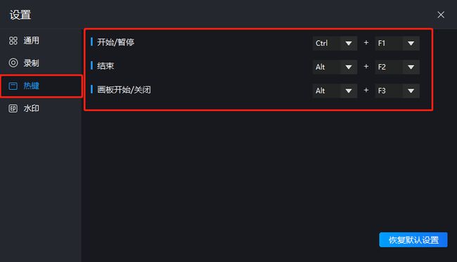 以及咱们能够直接运用快捷键进行开端完毕录制的操作!而快捷键怎样运用呢?在界面上方“设置”中的“热键”咱们在此就能得知开端完毕的快捷键是什么,体系是有默认设置的。而且咱们要是想要自己去设置快捷键的选择组合,也能够依照自己的喜好进行设置!
