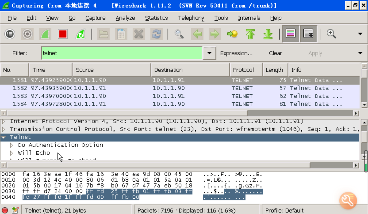 客户端:安装 Wiresark, 然后Telnet服务器的 IP, Telnet 10, 然后你会看到欢迎界面 。