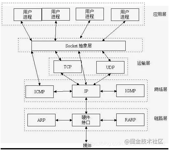 如图所示,Socket是连接TCP/IP社区的中间软件的抽象层,是接口的集合。TCP/IP是在操作系统中实施的,Socket是操作系统中将应用层核化的一系列界面。Socket覆盖TCP/IP,使用TCP/IP发送数据,调用Socket的输出流,使用TCP/IP接收数据,调用Socket的输入流,以及掌握TCP/IP和Socket之间的关系的时间。