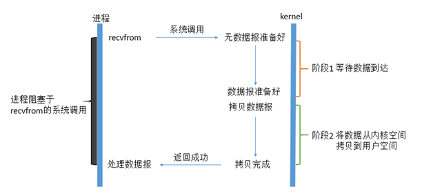当用户进程调用系统后, 内核开始IO的第一阶段: 数据准备。 对于网络 i, 许多次的数据没有在开始时出现( 例如, 尚未收到完整的 UDP 软件包 ), 而当内核等待足够数据到达时 。 而对于用户进程, 整个过程被阻断 。 当内核等待数据准备好时, 它会将数据从内核复制到用户进程 。