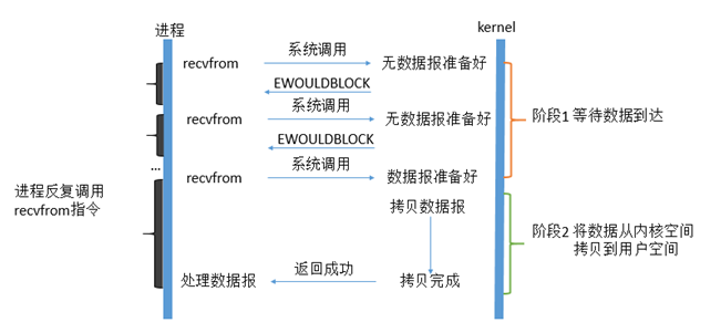 因此,用户过程的第一阶段没有停滞不前,需要不断进行主动询问,以确定内核数据是否已经准备就绪;不过,第二阶段仍然受阻。