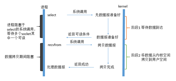 当用户进程调用了select,整个过程将被屏蔽,同时,内核将“观察”所有负责插座的插座,当插座中的任何数据准备就绪时,音量将返回。此时,用户程序被称为阅读操作,将数据从内核复制到用户程序。