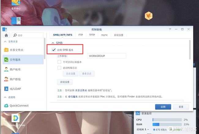 因为SMB文件共享服务对于将NAS转换成本地硬盘至关重要, 我们必须让 SMB在NAS中提供服务。