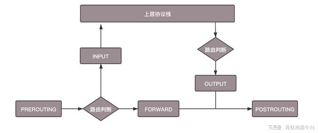 首先, 取MAC 信头, 看看它是否是我的。 如果是的话, 请取 IP 信头 。 在此之后, 获取目标 IP 并启动路线判断 。 在对路线进行判断之前, 此节点被称为 Preroting 。 如果我发现IP 是我的, 包应该是我的, 把它传送到上面的传输层, 这个节点叫做 INPUT 。 如果您发现 IP 不是我的, 您需要转发它, 这个节点被称为 Forward 。 这个节点名为 OutPUT, 代表着前方或 OutPUT, 这是路线决定的结果 。 最后一个节点是 POstrOUT 。