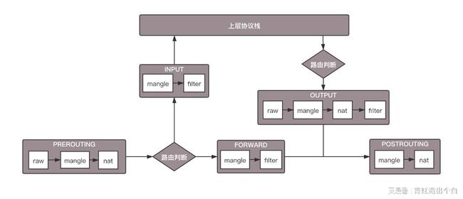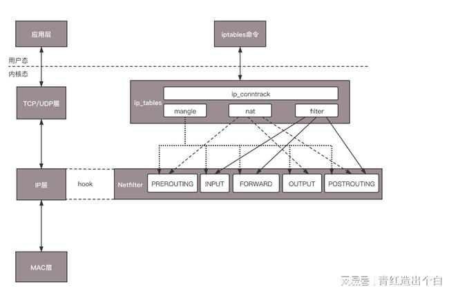这是因为Linux内核有一个称为 Netfilter 的框架, 它可以在这些节点中插入 Hook 函数。 这些功能可以截取数据包并干预数据包, 例如, 进行特定的修改, 然后决定是否去 TCP/IP 议定书仓库; 或者把它还给协议仓库, 即 ACCEPT; 或者过滤它, 不再传输, 即 DROP; 以及 QUUUE, 它将它传送到用户的尖端程序 。