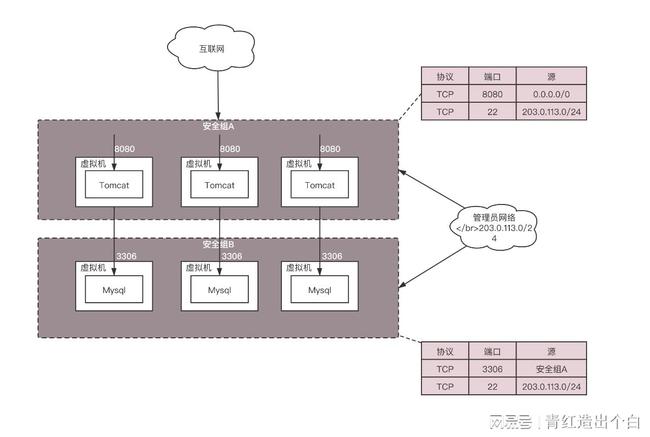 我们把MISQL的虚拟机器放在安全组B。在安全组B中,只有安全组A的计算机才允许进入港口3306,然而,在Ssh 22港口,管理员网络也允许在安全组B中授权MISQL的虚拟机器进入。 在安全组B中,只有安全组A的机器允许进入港口3306,但对于Ssh 22港口,管理员网络也允许进入。