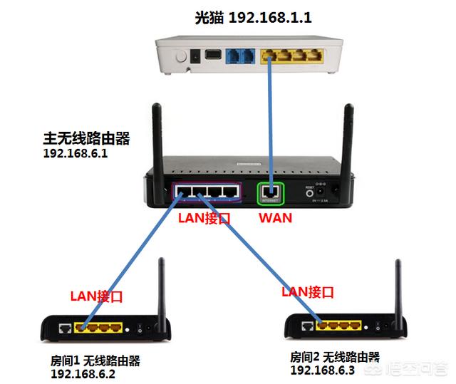 额外的路由器用作无线开关,通过局域网港连接到主路由器的局域网港,而WAN港没有用来连接主路由器设置开关。