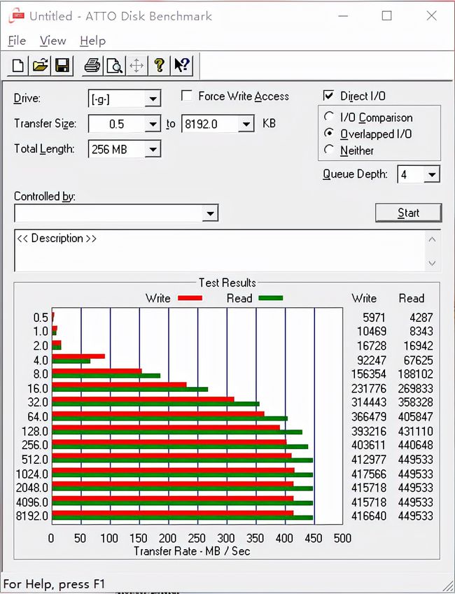 ATTO程序是一个简单和易于使用的磁盘传输速度测试软件,允许硬盘、移动硬盘、磁盘、存储卡和其他设备以416 MB/S和449 MB/S的速度读写,如下图所示。