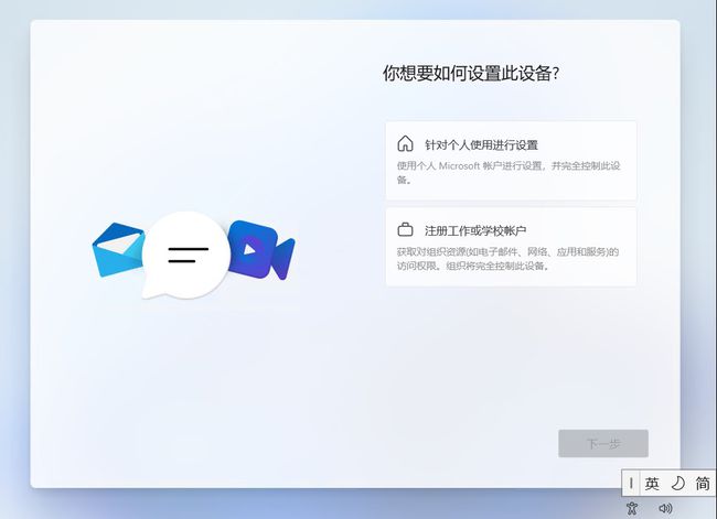 在此点, 计算机将重新启用, 下面的界面将在重新启动后显示 。 选择是否将计算机用于个人或工作学校账户 。 单击 [ 下一步] 在设置完成后继续安装 。