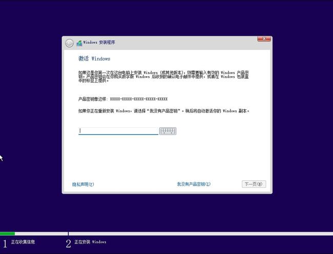 如果您有 Windows 11 操作系统的已安装序列号, 请在现阶段输入, 如果您只想安装 Windows 11 体验, 请单击 [我没有产品键 继续安装 。
