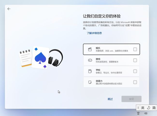 以下选择是选择必须安装的 Windows 11 操作系统组件,如果不需要安装,则点击 [跳 记录下一步。