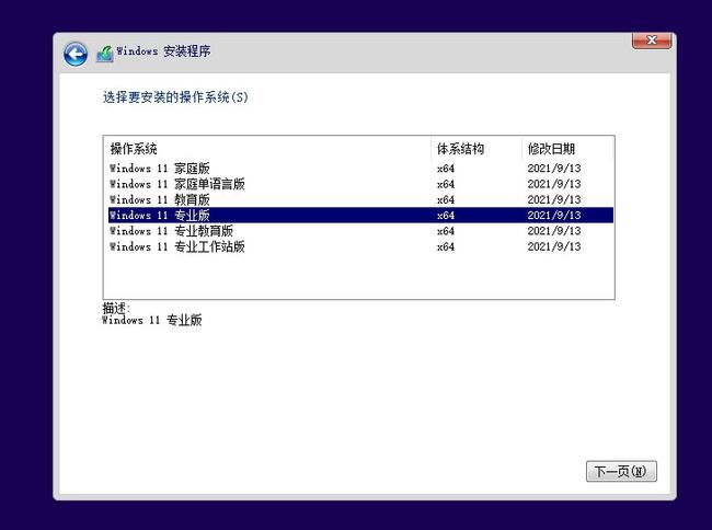 例如,此屏幕决定需要在这里安装的 Windows 11 版本。 选择安装 Windows 11, 然后单击下一页继续安装 。
