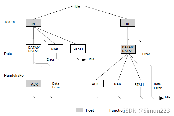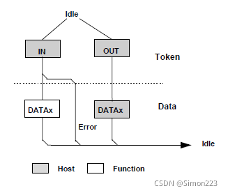 系统只能有一个主机, 与设备的所有互动都是从主机的角度进行的。 主机是一个“ 上行” 组件, 设备是一个“ 下行” 组件, 从主机向外部移动数据的运作称为 Out 传输。 从外部向主机移动数据的操作称为 IN 传输。 主机( 特别是主机控制器) 调节所有通信, 并向设备发送指令 。