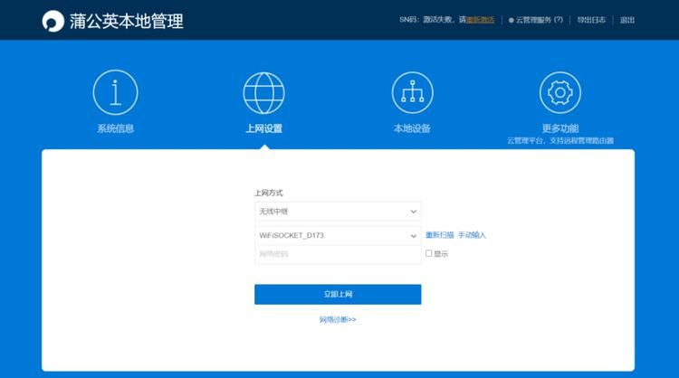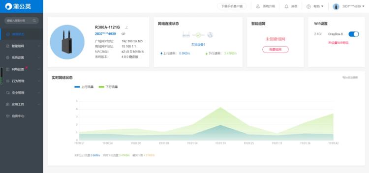 本地行政接口完成后,该系统立即切换到SN编码登录界面,用户可从该界面中使用路由器上的SN码和第一个登录密码管理员访问Penthouse R300A的后台办公室管理中心。由于这是一个工业路由器,后台管理中心比常规路由器包含更多的功能模块,例如智能群落网络、行为管理等等。