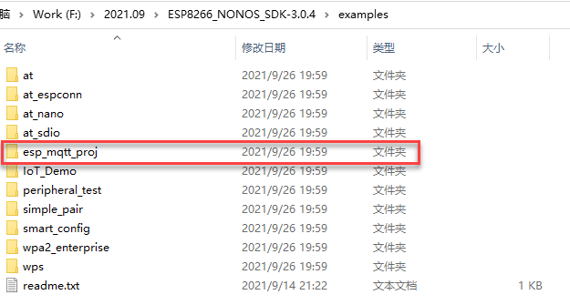 我们现在要做的就是测试 MQTT相关程序 所以我们...esp_mqtt_proj例程从examples文件夹下拷贝到ESP8266_NONOS_SDK-3.0.4同时删除根目录中的所有内容 。examples、driver_lib、third_party删除后的项目结构如下图所示: