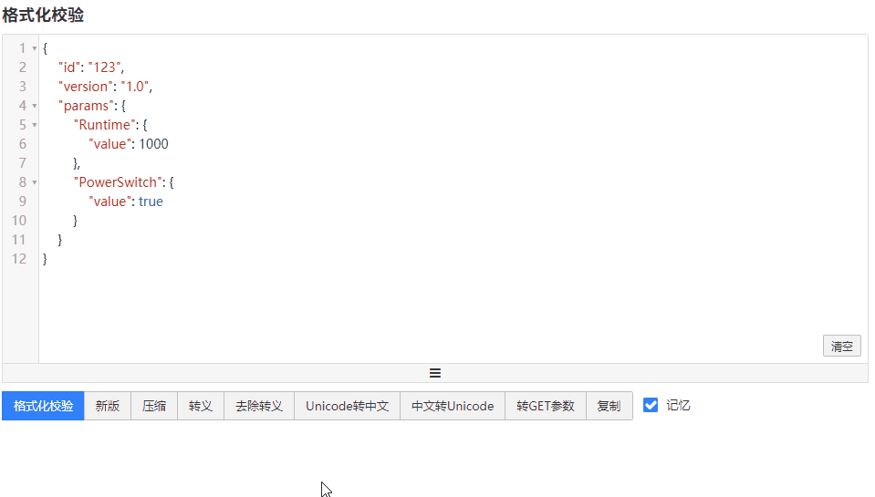 {"id":"123","version":"1.0","params":{"Runtime":{"value":1234},"PowerSwitch":{"value":false}}}