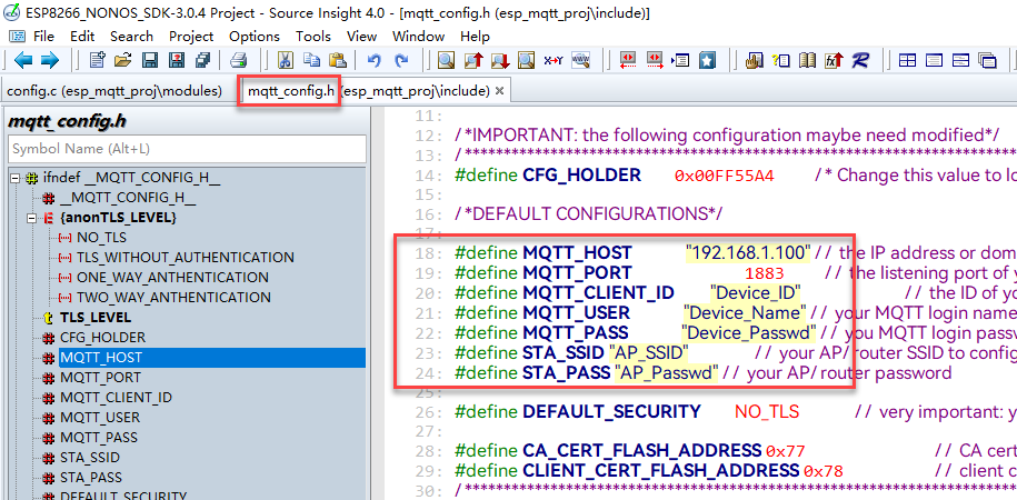 修改esp_mqtt_proj例程中的配置文件:ESP8266_NONOS_SDK-3.0.4esp_mqtt_projincludemqtt_config.h。