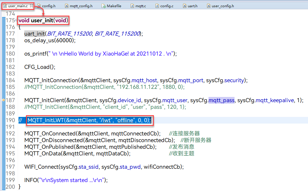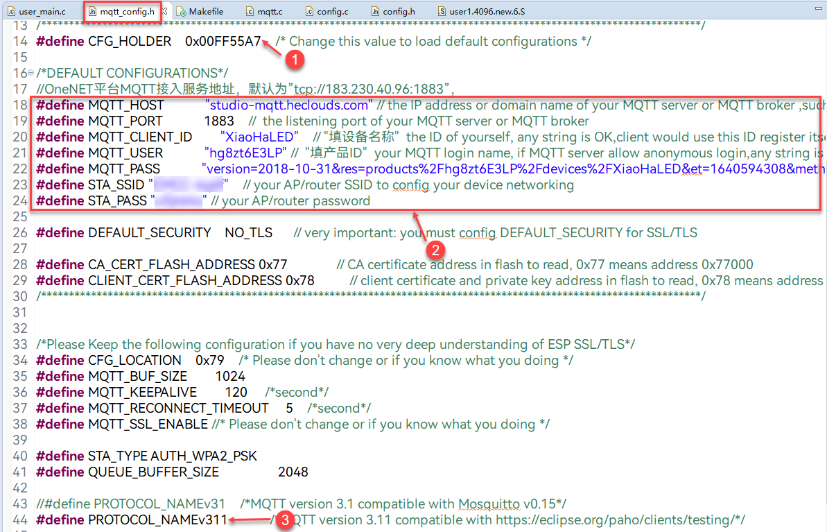 根据注释,①位置的CFG_HOLDER变量+1或1可在每次修改后调整;否则,在每次修改后,系统配置不会被更改对数或对数可试性,+1或1或1可调整;在每次修改后,系统配置不会被更改;否则,如果CFG_HOLDER可变值变化, 导致新的固态写入参数, 如 WiFiSSID、 WiFi 密码、 MQTT 域名、 端口号、 MQTT 用户名、 SysCfg 结构变量的密码, 并将结构信息写入 Flash 。