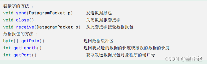 DatagramSocket( 端口) : 构建并绑定所提供的无障碍端口 [经常用于接收] 。