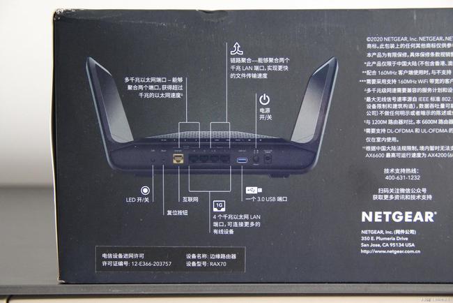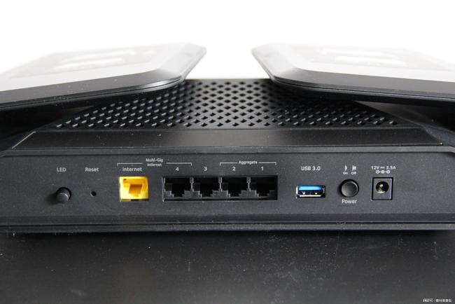 LED光开关、重新定位、一个WAN+4LAN(支持链趋同)和一个USB3.0接口、电源钥匙和电源接口都可见于后方接口,从左向右可见。