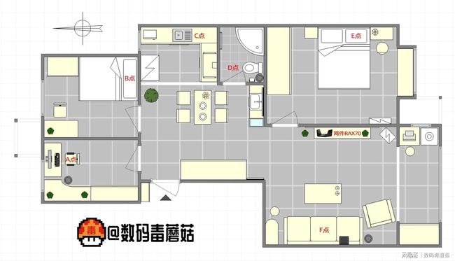 在110平方米的地方,在客厅电视柜上安装了路由器,它能够将整个房间安装5G(WiFi6符号将显示在家中的每个角落)、打开双频率并完成净速测试。 6个ABCDEF速度点中的每个点被选为实际使用的复制品,B点是限制距离和限制穿透。 制造商将提议将路由器安装在客厅电视柜上,有可能在5G之前覆盖整个房间(B点是限制距离和限制穿透度)。