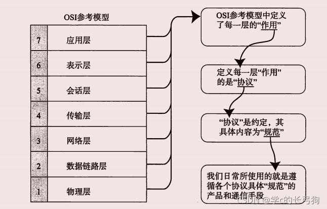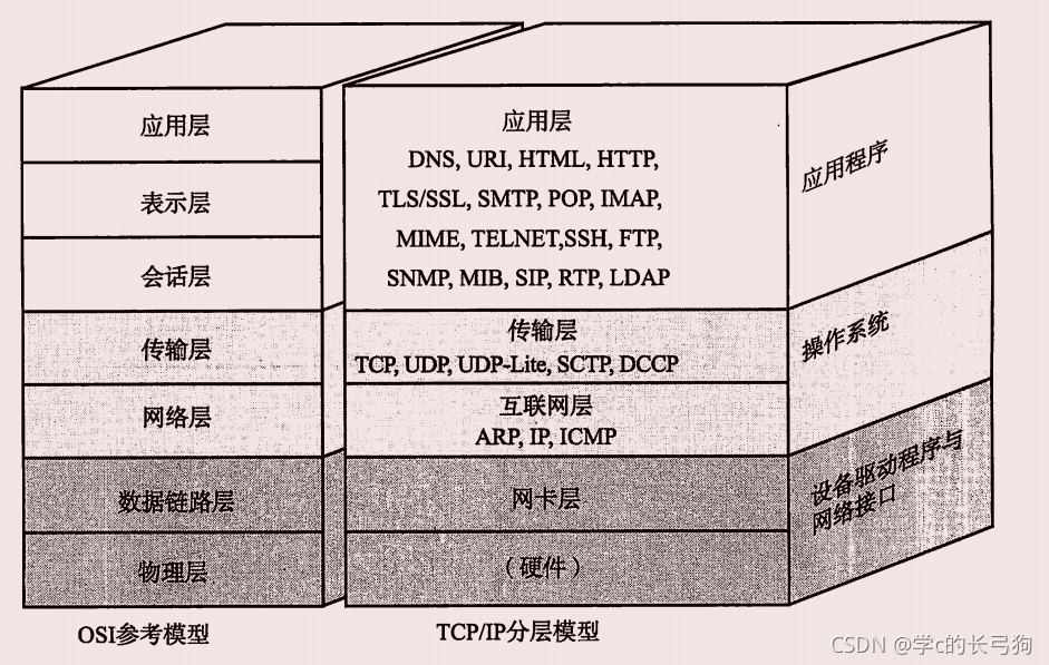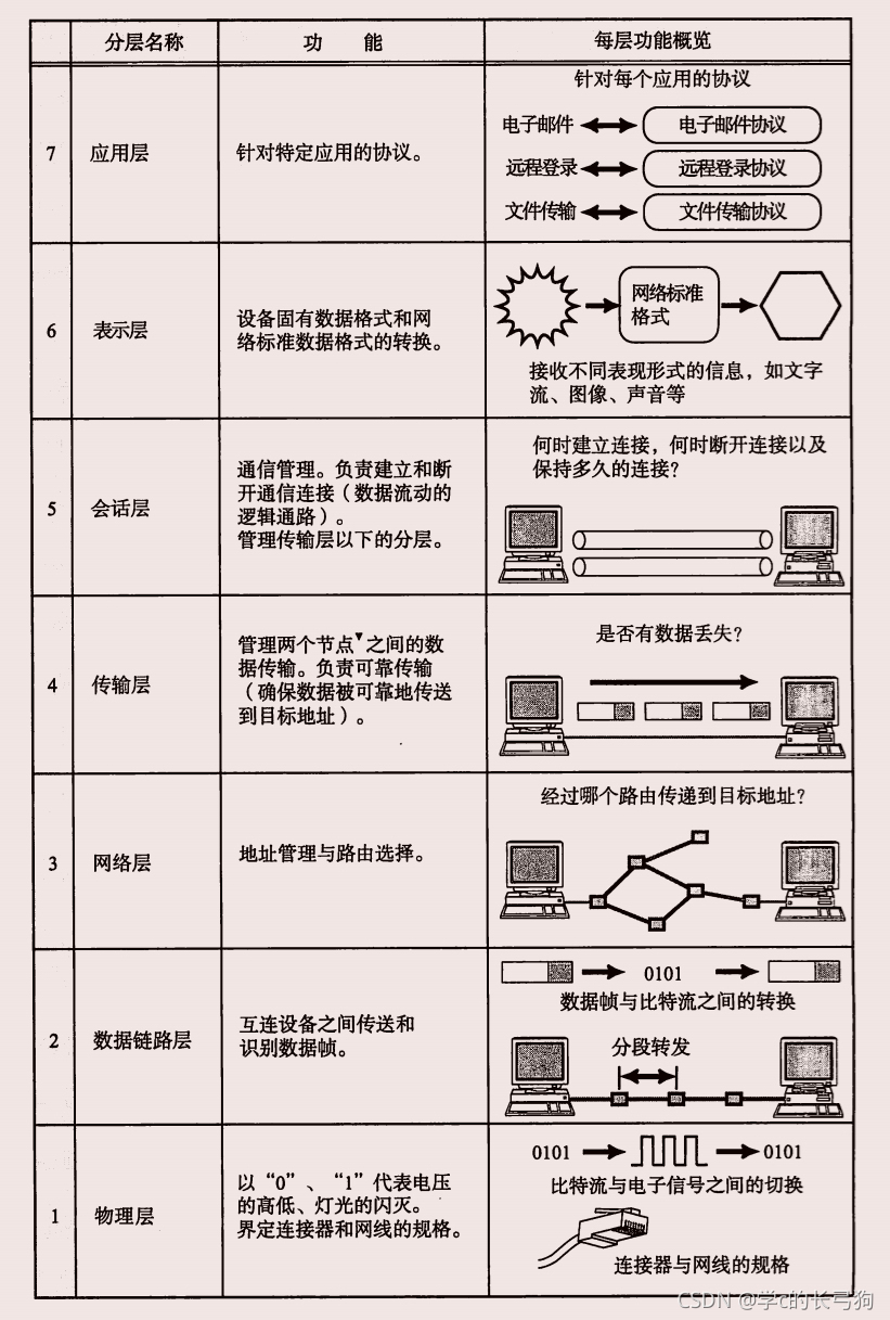 比较而言,OSI模式更侧重于“通信协议需要什么功能”,而TCP/IP则更侧重于“在计算机上达成协议需要建立的程序”。