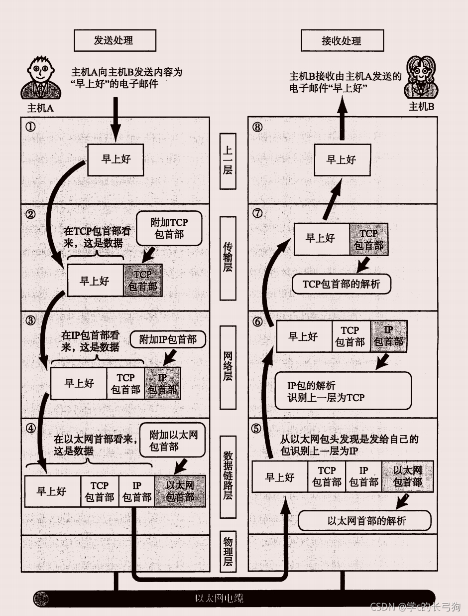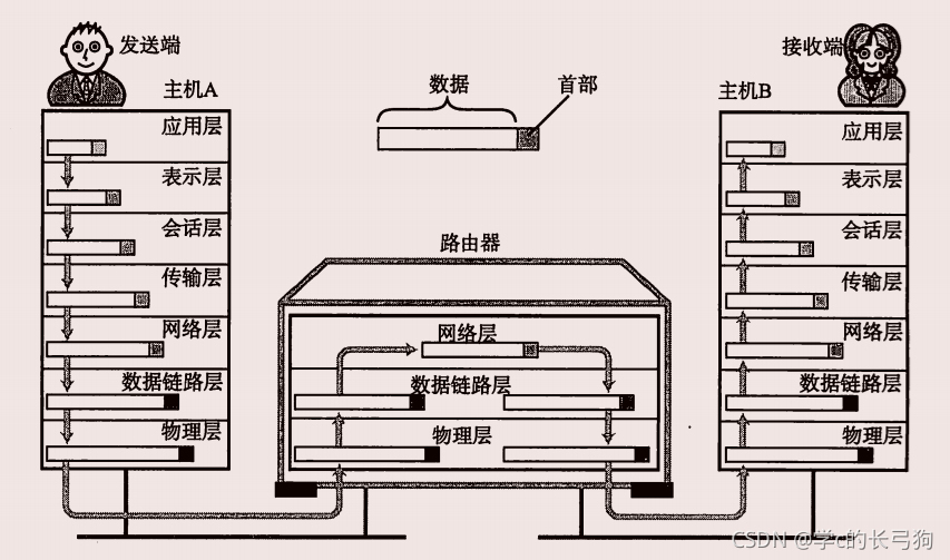 每一层都对传输的数据附加一个标题,提供该层的基本信息,例如传送的目的地地址和协议信息。一般而言,为协议提供的信息是在软件包的开头,发送的内容是数据。