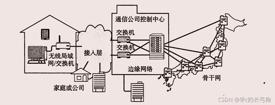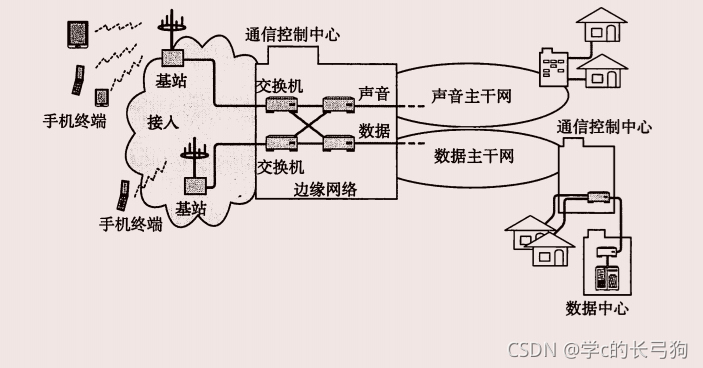 与最近的基地站进行无线通信,该基地站有蜂窝天线,与网络的“接入水平”相对应。该基地站收集并向控制中心(“边际网络”)发送通信请求,控制中心随后与连接通信控制中心的骨干连接。