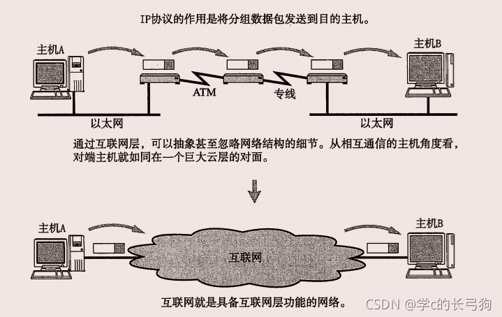 因特网层采用类似于OSI模式中第三个网络层的IP协议,IP协议以传送分包数据的IP地址为基础。