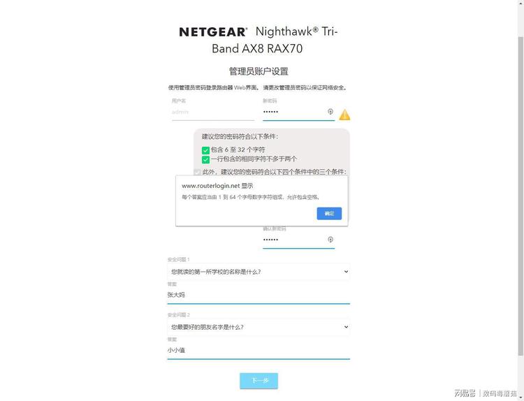 后来我看到一个BUG, 其路由器用户名管理员无法更改, 密码无法接受它的六位简单字符, 但安全问题不太可爱。 安全问题的问题部分是中文, 但如果您用中文回答, 您必须使用 1- 64 个字母或字符..
