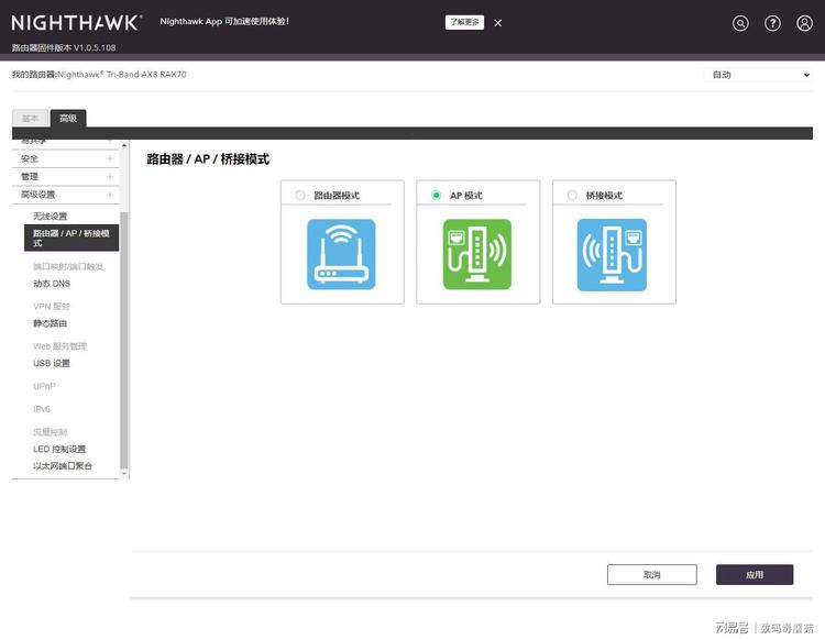 许多先进的界面设置包括全面的改变,如路由器功率、时间开关WiFi、将路由器转换为AP模式等等。 但是,许多设置都变得灰色,在转换到AP模式后无法改变,后者使用路由器作为无线开关,不具有管理功能。