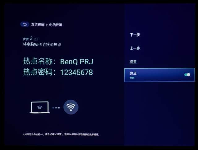 网络环境没有覆盖的会议室不需要紧张,所以可以处理明吉E520智能商业投影机系统的直接连接投影功能。投影机自己的热点被打开,计算机电话被连接到无线投影的热点信号中,其效果与WiFi环境相同。
