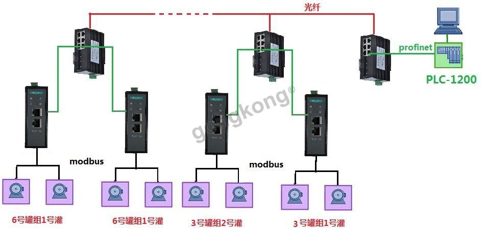 1.案例简介:本案例现场在在4-6型坦克单位中,雇用了拥有15万吨储油设施的天津市燃料石油公司,每坦克6至12个不同的坦克,每坦克2个。电阀用于控制油流进出罐体。modbus的通讯协议,PLC使用的是西门子1200系列PLC,现场采用PROFINET以太太网的工业互联互连将Modbus转换为Profinet网关。由于罐体与控制室之间的距离,该设施的设计具有开放性情报。WYS208/2F本案的功能是管理油箱中的油、油流开关和将电阀放在控制室。