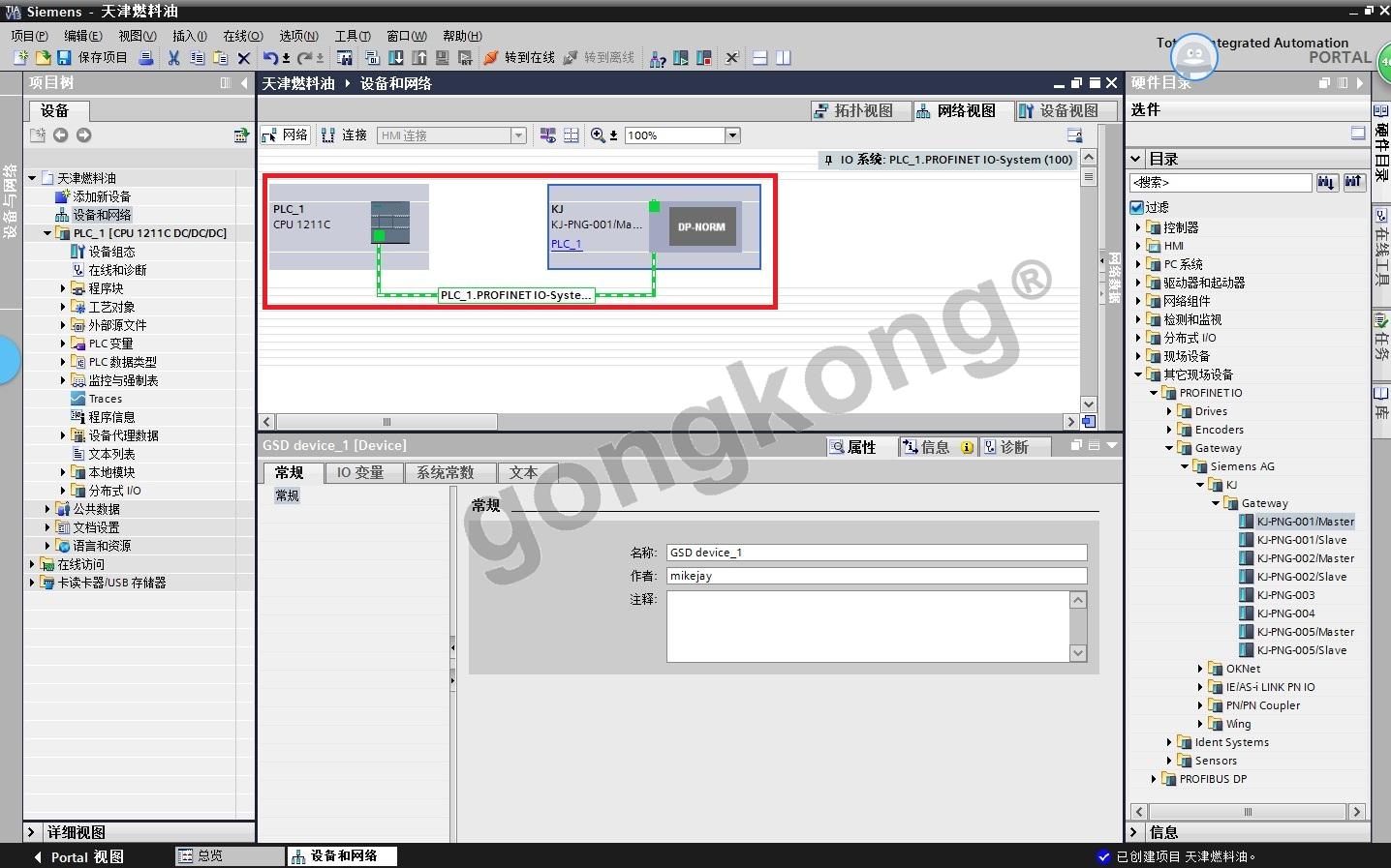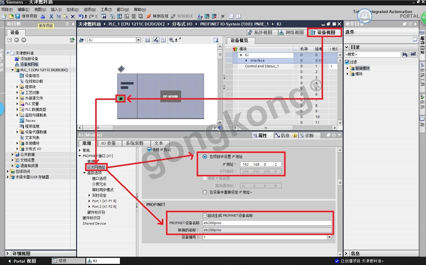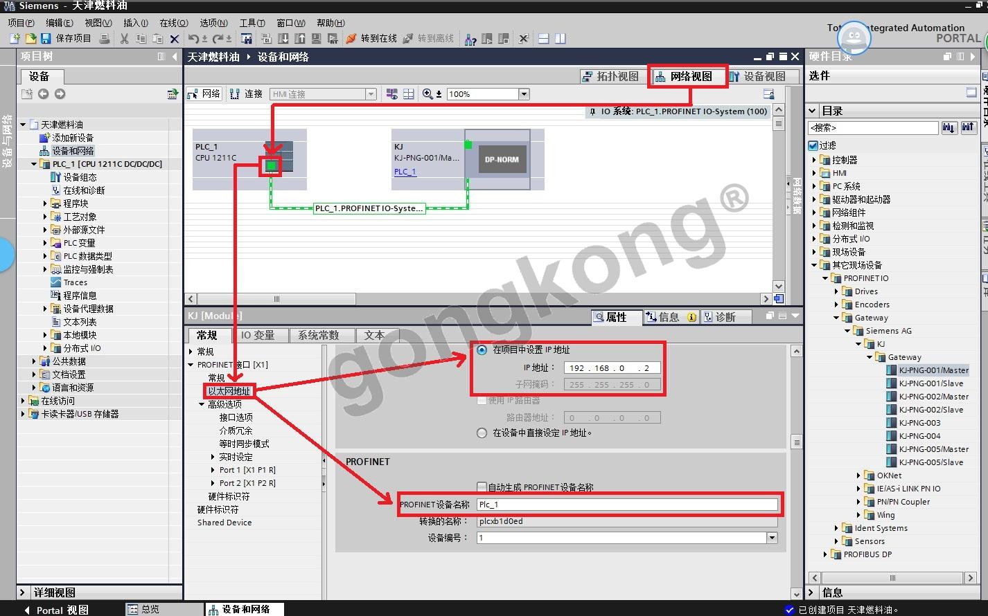 (10) 硬件分组 - 配置组合式 Modbus 转换 ProfiNet 网关 KJ-PNG-001 的 IP 地址和名称(此处设定的指定参数与实际 PLC 参数兼容),如图3-11所示。