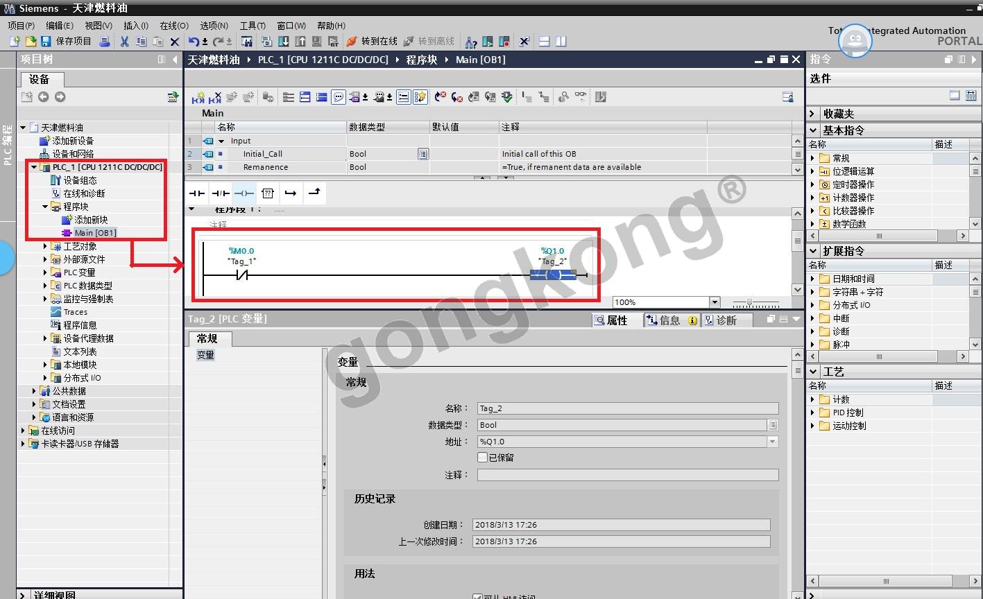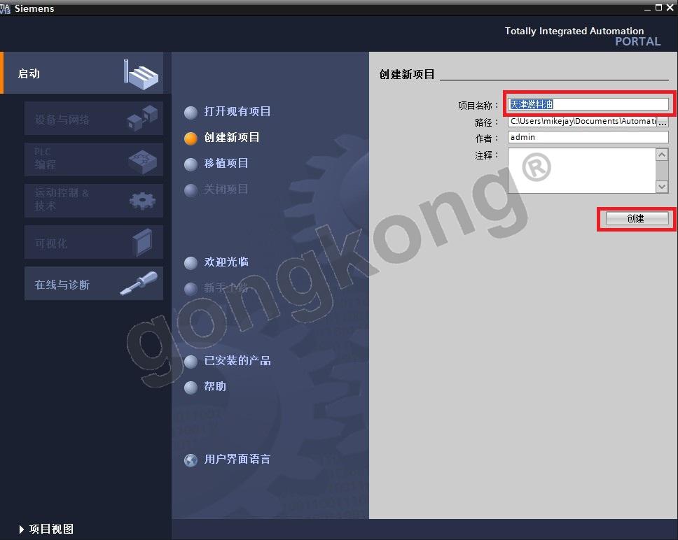 (1) 打开博途软件 “TIA Portal V13 ”创建新项目—>输入项目名称—>创建。图3-1: