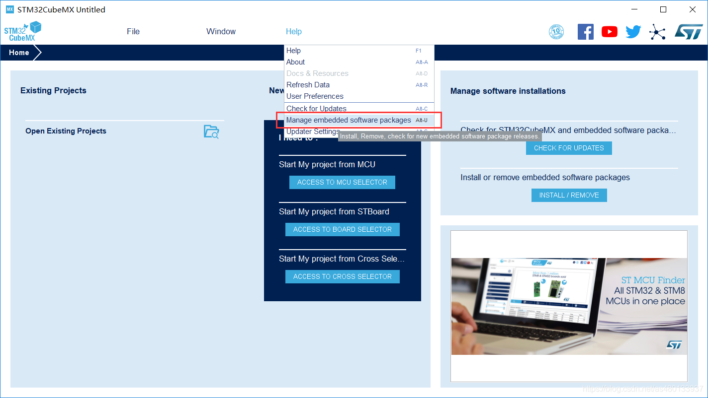 打开安装好的 STM32CubeMX 软件 点上面的Help -> Manage embedded software packages