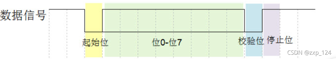 当发件人发送字符数据时,它首先发出逻辑 " 0 " 信号,而这个逻辑低水平是起始位置(下方)。起始位置通过通信线流向接收设备,当接收设备检测到这一逻辑低水平时,它开始准备接收数据信号。因此,起始位置被用来标记起始位置。