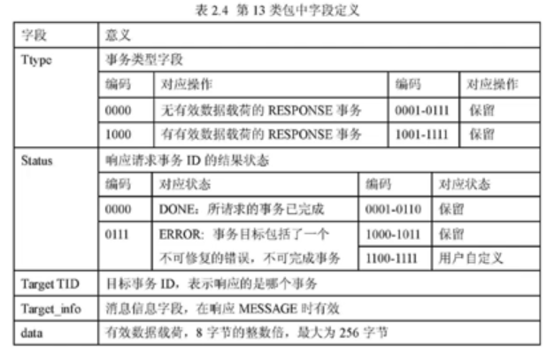 第13类列出了数据有效载荷和无数据负载的数据类型,这些数据由ttype本地域编码确定。 目标服务标识与响应软件包响应的请求标识相同,请求将与请求匹配。 如果响应软件包包含数据,数据将出现在目标内容标识之后,需要注意没有本地域,以表明回复中所含数据的长度和大小,接收方将需要在软件包结尾处进行判断。