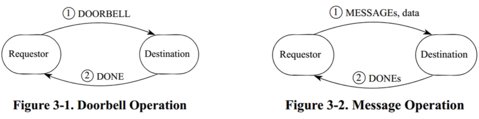 REIO定义了10和11类信息传输包。第10类是DOORBELL,它有一个精简的头,只能容纳16个数据负荷。DOORBELL常常用来将控制从一个CPU转移到另一个CPU。第11类用于信息操作,可以传送4096字节的数据。如图所示,DOORBELL完成了一个DOOELELL操作并作出反应,MESAGE也完成了一个MESAGE操作和反应。