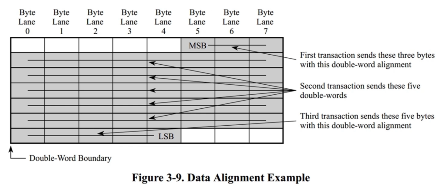 图3-9显示48字节的数据流,其中处理组件希望通过一个相互关联的结构将数据传送到另一个组件中。图片中的阴影代表将要发送的数据。由于发送部件与两字边界不匹配,发送部件将交易分割成至少三个独立的问题。 40字节;给 RIO最多256字节,因此40字节可以在一个交易中传输;第三字节与其余5字节一起发送,表示字节的有效性。