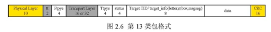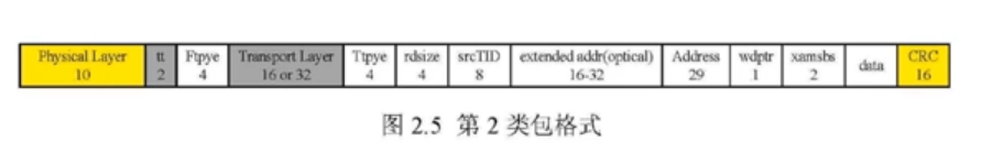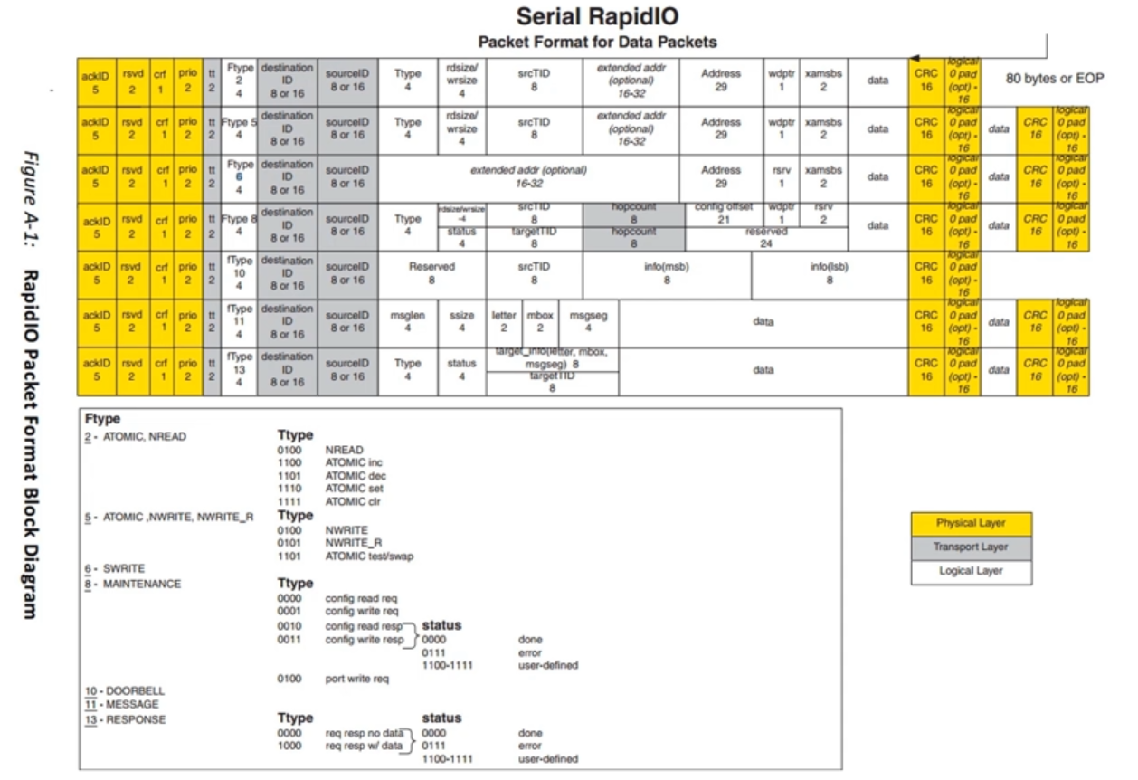 RIO 服务包含在包件中,这是系统端点设备之间通信的基本单位,而 RIO 包件包含物理、逻辑和传输层的信息。所有 RIO 包件从物理字段(图中为黄)开始,包件完全由逻辑层字段定义:格式型F类型和服务类型T类型T类型。