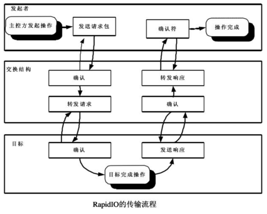 对于一个操作,启动装置向交换结构发送请求,开始运行,在收到请求时交换控制符号,确认收到请求,然后将请求转发到目标端点,接收请求并完成操作,发送回复服务,在收到回复时交换控制符号,确认收到回复,向启动装置发送回复,在收到回复时发送控制符号,表示对响应包的确认,从而完成操作。