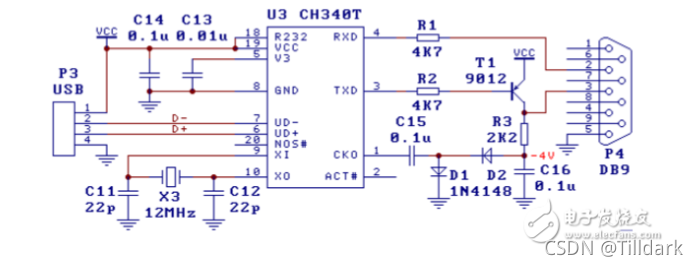 该图同样描述了USB的三线RS232链条,只有略低水平的RS232电解输出除外,CH340的R232英尺设为高层,辅助的RS232功能启用。二极管、三极管、抗体和电容器可以使用,而不是7.2.U5,这是这一节中的一种特定的水平转换电路,降低了硬件费用。