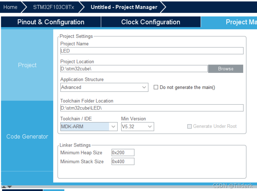 使用项目管理器配置路径和工程名称后, 将 IDE 条目更改为 MDK- ARM 。