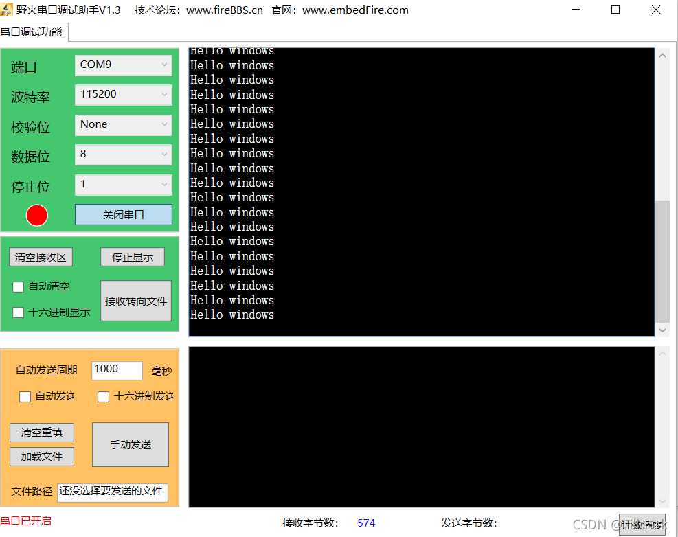 下次启动野火串行调试助手, 输入以下命令打开串行, 并查看结果 。