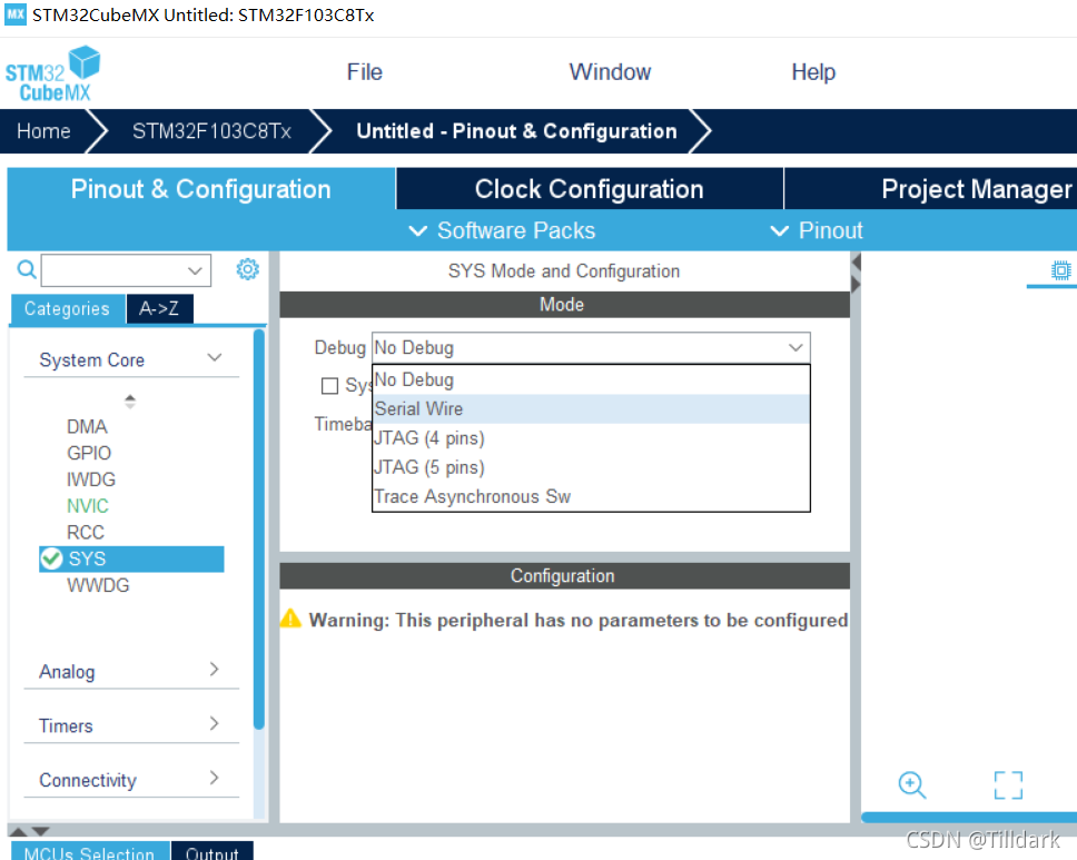 选择系统核心, 然后 SYS, 然后在调试中选择串行线 。