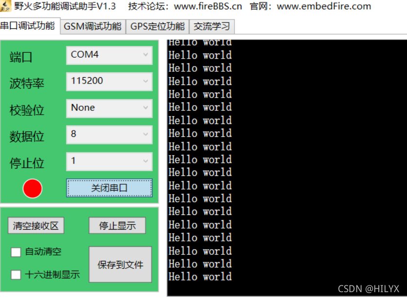启动野火多功能调试助理, 将弹出接口配置为 115200, 一次中途停留, 没有检查站, 并接收来自 C8T6 Hello World!