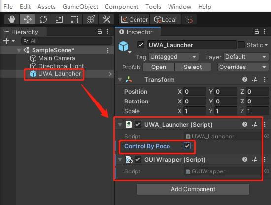 在项目中添加 UWA_Launcher 文件, 包括将 UWA_Launcher 拖入项目的第一个场景, 确保销毁不被强制; 然后在 UWA_Launcher 中勾选 Poco 测试选项。 这为在随后的测试中访问 Gond Online 服务提供权限, 以控制 Poco 脚本的相关功能的启动和关闭 。