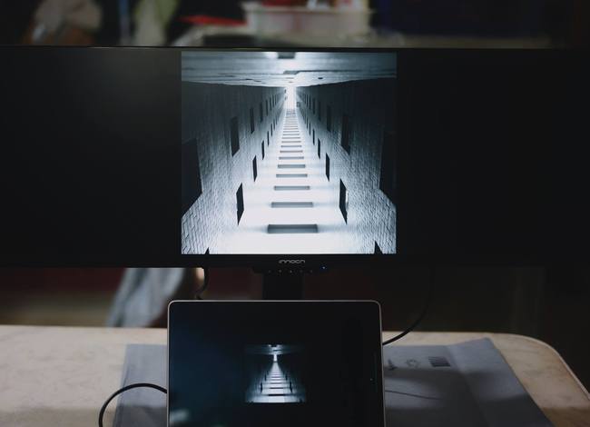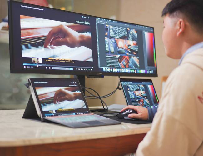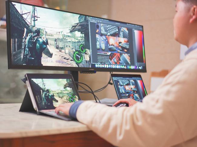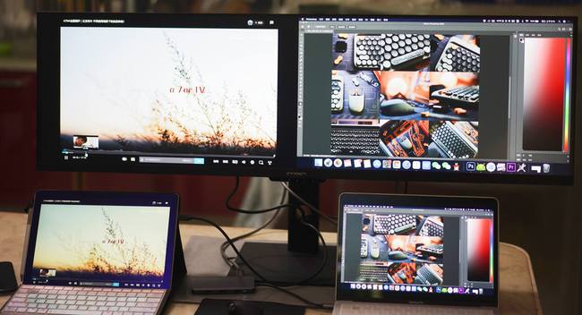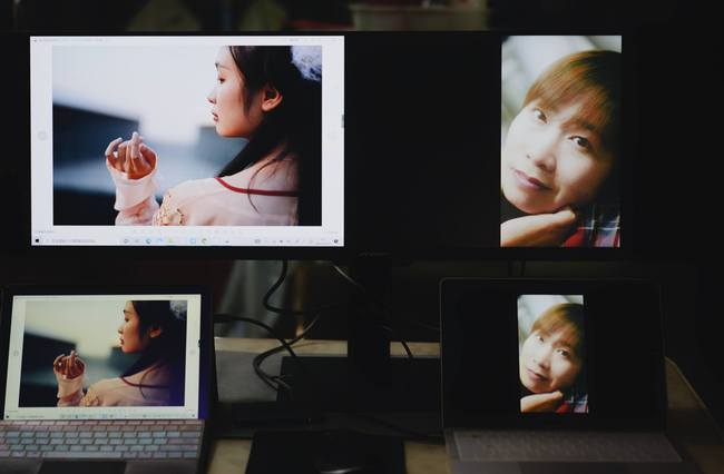 INNOCN 44C1G 屏幕如此大, 毫无疑问有一个比另一个更有用。 我试图同时在屏幕上放一个 MacBook Pro 2017和一个水面Pro 7, 效果很好。 没有延迟, 没有框架断裂, 没有滞后, 下两个装置可以共享一个监视器 。